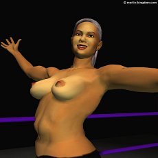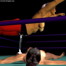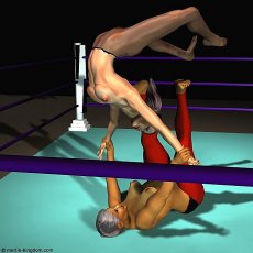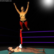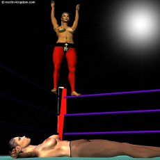 | Sonya lies spread-eagle on the mat moaning softly as the big Algerian looks down at her with pure contempt. Then Leeha moves to the corner and clambers to the top rope. Carefully she stands on the ropes and raises her arms like a high-board diver. Now she yells something unintelligible at the crowd before launching herself into space towards her smitten opponent. | ||