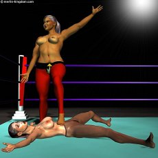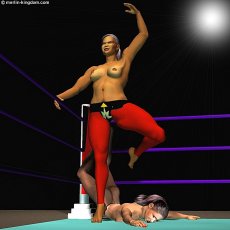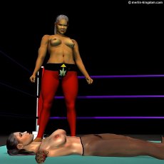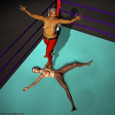 opponent and immediately raises her arms in triumph. She places her foot on Sonya's belly as the Announcer starts the count, "ONE, TWO, THREE..." As the count proceeds Leeha moves her foot onto Sonya's breast |