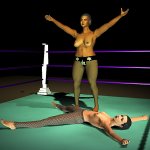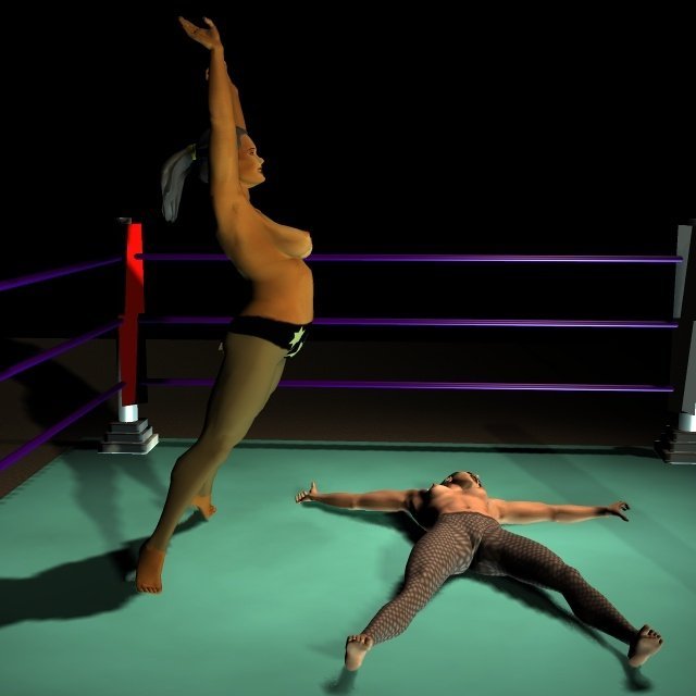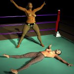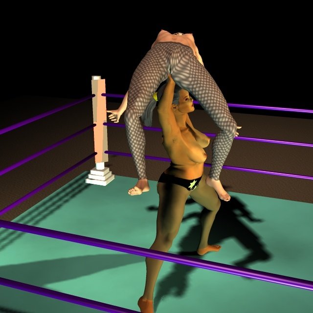 Leeha paraded Sancha round the ring for several tens of seconds, displaying her immense strength and endurance to the audience. After what seemed an age, she hurled Sancha forward so that the Spanish girl plummeted towards the canvas with her arms and legs spread wide. Actually Leeha had done Sancha a favour by holding her aloft and delaying the drop to the canvas. It allowed Sancha to regain some of her senses, so at least she was able to react when eventually the Algerian decided to throw her to the mat.