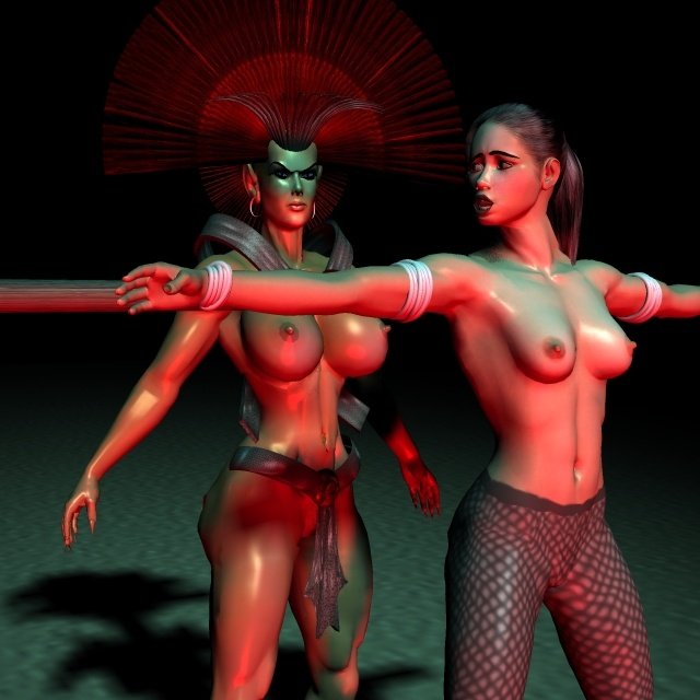 Totally unsettled by these awful dreams, Sancha lay awake for another two hours before she eventually dozed off again. But it was if the demons of the night had been waiting for her. No sooner had she drifted off than she found herself roped to a bar in a darkly lit chamber. She sensed that there was someone or something behind her and suddenly into her view came a female creature wearing a huge head-dress. The creature moved closer and closer until its steely cold breasts were pressed hard against Sancha's warm soft flesh. Then the creature leaned forward and breathed into Sancha's face, and its breath was cold and dank like the grave.