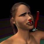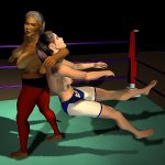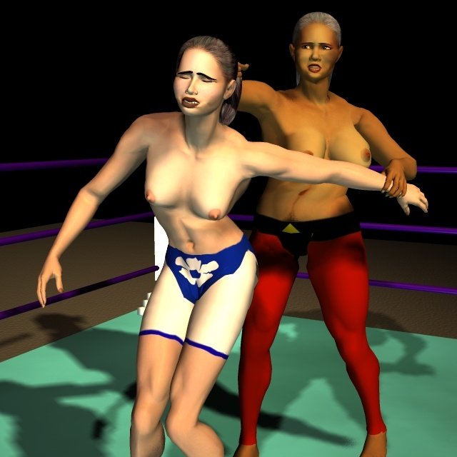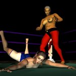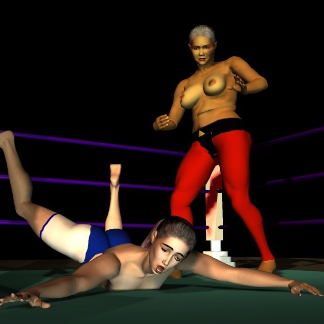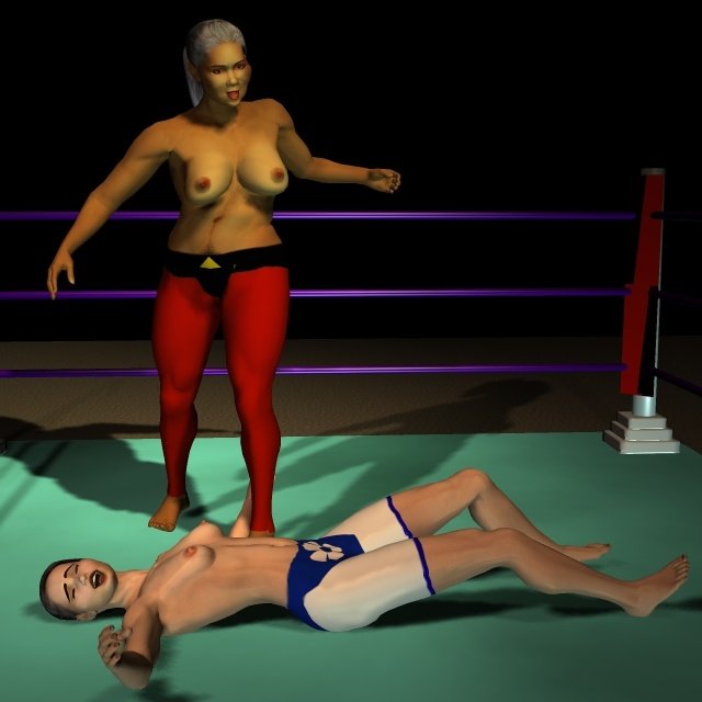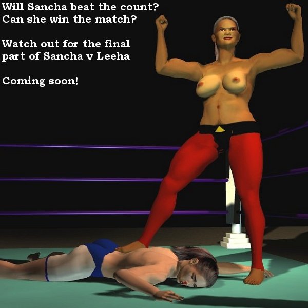 Sancha crashed to her face on the canvas and lay horribly still, as if dead. Feeling sure of victory, Leeha placed her right foot on Sancha's back and raised her arms in triumph. One of the officials told Leeha to take her foot of the Spanish girl so that a count could be started. Reluctantly the Algerian stepped back and the count commenced.