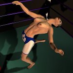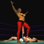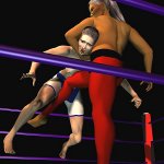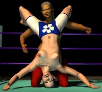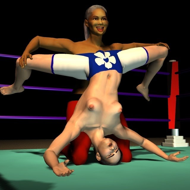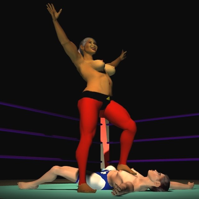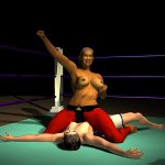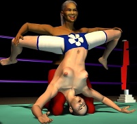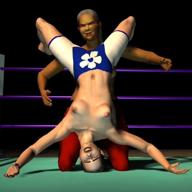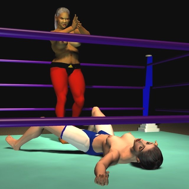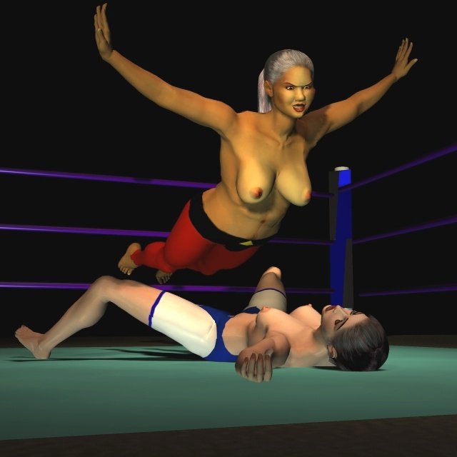 Sancha crashed onto her back on the mat and lay moaning softly, making no attempt to get up. The Algerian slapped the palms together in a gesture that suggested she still had work to do. Then she ran forward and launched herself into the air to swoop towards Sancha in a full contact body-splash. All 170 lb of Leeha slammed down on the Spaniard with an enormous crash that set the whole ring bouncing and shaking.