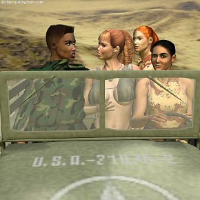 now run out of gas. The party was being held at a rented house in a remote area of New Mexico. Her friends, who had a detailed map of how to get there, had left Santa Fe that morning, but Alison had decided to come later as she had a modelling job to finish that afternoon. Now she was totally lost, out of gas and also out cell-phone range! It seemed like an hour, but it can't have been that long until Alison heard an engine in the distance. A truck pulled up containing 3 female soldiers who offer to give her lift to get some gas. |