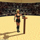 calls the MC. Into the Arena marches a young woman, about 5' 2" tall and weighing about 110 lbs - some 6" shorter and 50 to 60 lbs lighter than Andhra. Andhra looks in amazement at her challenger as a huge roar with of laughter erupts from the crowd. "She's a midget!" shouts one of the crowd. "Watch your knee-caps Andhra!" shouts another. |
