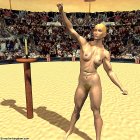 calls the MC Immediately the muscle packed Ettracan enters the arena. Over the last 6 days she has gained some respect from the crowd, so her entry is greeted with less hostility than on the first days of the games. She marches across the arena to where the Great Bull stands glistening on its plinth. She looks at its heavily textured, oiled surface and smiles. "The Thracian better have a big cunt!" she shouts out, causing the crowd to burst into laughter. |