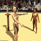 the Mistress of Ceremonies calls them to order: "We now come to the main event of the day, the sixth challenge to Andhra, Queen Lydia's undefeated champion. Today's challenger is Medana, from the Thracian people. Queen Lydia has agreed to the Thracian Consul's requested that we decide today's match by the use of the 'Great Bull of Apollo'" A loud exclamation rises from the crowd. The 'Great Bull' is a thing of legend that few have seen. It is reputed to be a huge golden phallus that was given to the Thracians by the sun god, Apollo. The Thracians now use this sacred object to decide the outcome of fights between prospective leaders of their tribe. "Bring in the Great Bull!" commands the MC. |