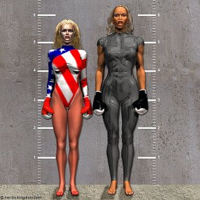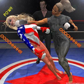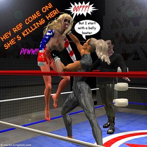 My name is Wendy Richards and I am an an amateur boxer. I guess you'd say I am quite successful as I am the kick-boxing champion of the Wonder Woman Boxing Federation (WWBF) based in Fort Worth, Texas. Usually I fight under the ring name of Americana, which is how you may of heard of me. The WWBF prides itself on accepting any challenge which is thrown its way from other fighting clubs. Because our girls are strong and brave, and we train hard, we usually win such challenges. So when a challenge was received from the Black Widow Boxing Club of Juarez, Mexico for a shot at the WWBF champion I wasn't unduly worried. We'd had matches against the Black Widows before and our girls had always come out on top. In fact a couple of years before, while I was still a relative rookie, I had had a topless fight with a Black Widow girl, which I had won by a TKO in the first round. So I accepted the fight without hesitation and without checking who they would be putting up. The fight was to be fought close to the Mexican border at El Paso and I travelled down on the day of the match with my boyfriend and trainer Tim. We checked in to the venue at about 6 o'clock ready for the weigh-in at 7:00pm. It was then that I heard the name of my opponent for the first time. Her real name was Vera Cruz, but she fought under the title of "The Hammer". I hadn't heard of her before, which I thought was a little strange. I would have expected to have heard her name on the grapevine, if she was up to challenging the champion of a rival club. When we came to the weigh-in I was dismayed to see how big and powerful my opponent was. Not only was she taller than me with a longer reach, but she looked a lot heavier and more muscular. Suddenly I realised that I might have made a serious mistake in taking on this challenge without doing my background checking first. Here are 4 thumbnails of scenes from the story: |