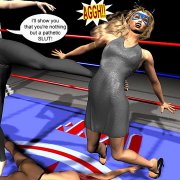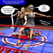 | Biker Bitch is destroying Sonia and is in the process of putting her out of the WCF for good when Victory gets into the ring to save her friend and lover. However, the Biker is not in anyway in awe of the WCF Champ and is soon beating the shit out of the Champ! | ||