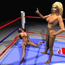 | Cries of "C'mon, Jas!!" and "You can take her!" come from the crowd. Jenna shakes her head at the audience as if to correct them, then grabs the dazed and hurting Jasmine by both ankles and drags her roughly from the corner into the center of the ring. | |