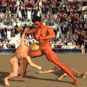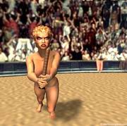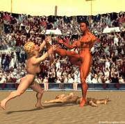 Zanda, one of the foremost Amazon warrior, is having a tough time defeating a pair of dwarf sisters who have challenged her to naked combat in the Amazon arena. Zanda has succeeded in flooring the redheaded Hana, but now turns to face the blonde Gerta who is charging at her holding a formidable wood and leather dildo...... Here are 6 thumbnails of some the 33 pictures in the