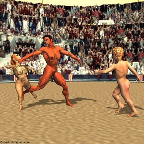 | Zanda now powers down on her prostrate foe and stamps on her neck. As the Amazon brings her weight down on Hana's neck, intending to crush the dwarf's wind-pipe, Gerta makes a flying leap onto her back. | |