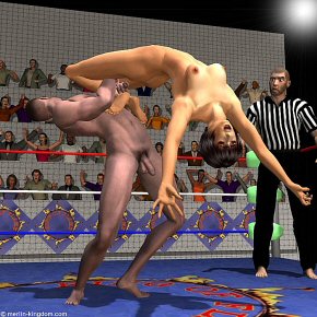 announces the Referee as the crowd quietens down. Cissy enters the arena to a huge cheer from the crowd. She is a regular fighter at the RoF and a firm favourite with the crowd. She jumps into the ring and is formally introduced by the Referee. She's a lightweight girl, but an athletic and spirited fighter with a nice cheery smile. For me the most notable thing about Cissy is her exceptionally thick, black pubic bush, which she has kept untrimmed despite it growing well beyond the bikini line. Introductions completed, the two fighters square up in the centre of the ring. The crowd call out their support for their girl as the difference in the size and weight of the combatants becomes more obvious. Here are 4 thumbnails that show some of the action from the story: |