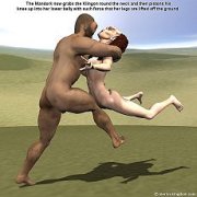 The Federation Starship Sceptre is trapped by the Klingons after accidentally straying into Klingon space. In order to free the ship one of the crew has to beat the Klingons' local female champion in a one to one fight. After the first challenger ( the Sceptre's female Security officer) is totally thrashed by the Klingon, a ship-wide call is put out for a volunteer to face the Klingon. To everyone's surprise one of the Sceptre's cooks comes forward. He's a big ugly Mandork who claims to have been a professional fighter before he became a cook. He says he has defeated many Klingons in his fighting career and would be only to pleased to dispose of this one. So the a few hours later the Klingon and the Mandork are beamed down to the surface of a remote planet to engage in naked combat. |