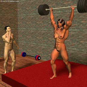 wrestling. The prize: his salary for one year - $100,000! In the previous months two women had tried to wrestle him, but were easily beaten, both forced to submit quickly and painfully. But what is talked about now is last month's match between Jarrod and a 19 year old male named Shaun. Problems arose when Shaun had innocently flirted with one of Jarrod's "girlfriends". Shaun didn't know what he had done until the match was under way when Jarrod called Shaun a "punk" for flirting with the girl, then trapped Shaun in a figure 4 leglock and not letting up even after Shaun's knee gave out. The gym , except for Jarrod's girlfriends, was totally put-off by the incident, but Jarrod wasn't fired because the match was not funded by the gym, but was part of a private competition. In the month that followed, everyone wondered whether there would be anymore competitions. The question had been answered the previous week, when an anonymous challenge was posted on the gym bulletin board. It had been signed "gym owner". The buzz among the members is that the owner is a "woman", but that isn't a certainty. So on the day of the competition Jarrod is standing, naked on the small stage waiting for this newest