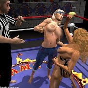Nikki and that I wanted her to lose. She called over this WCF management guy called Gor and the three of us discussed it for ages. Eventually Gor agreed that Jenna could take on the challenge, but at a hell of a price! I won't tell you exactly what it cost, but put it like this - you could get a good car cheaper! Three weeks later Jenna and I are standing in the top row of the Ring of Flames arena. The challenge match has been announced and Nikki has just entered the ring. Members can now follow the remainder of the story through the text in the pictures: |