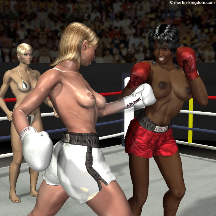 And Cherie opens the fight with a nice left underarm hook to Greta's breast. The challenger falls back ....