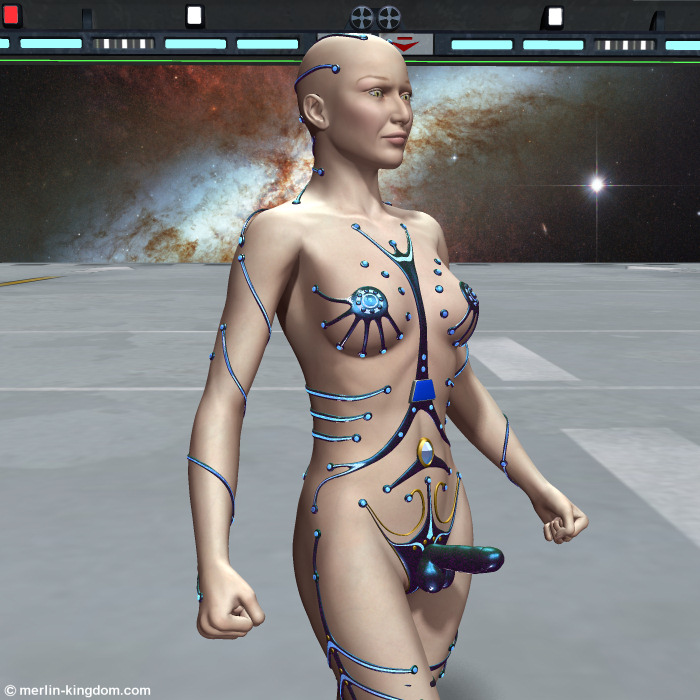 Syn lifts her eyes and sees another android strolling towards her. It seems similar to the one that is holding her except this one's wiring is coloured blue and it has a metallic looking cock!