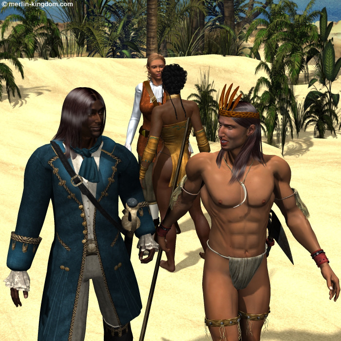 two fathers have to withdraw to a cove further along the shore. "We must wait until the winner comes to us to announce her victory!" says the Chief as he leads the Captain into the palm trees. |