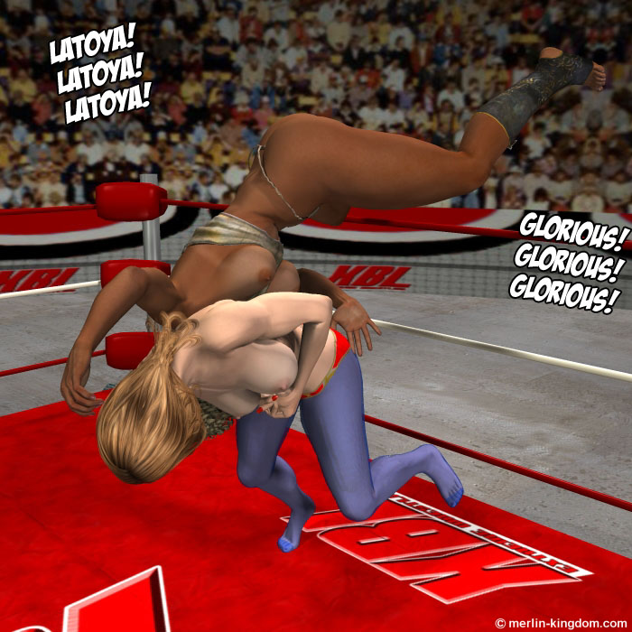 And Glory takes the big black woman down with a hip toss to the mat!