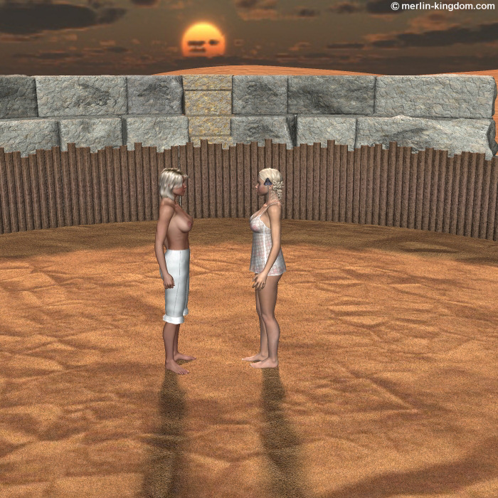 Later the same day ..... On a secluded part of the same island, as the sun was setting for the evening, Lady Lydia stood in a circular ring enclosure at the invitation of a young French couple. Elizabeth Deveraux and her husband Felipe, who were only very recently married, had heard via translation that there was a young titled English gentlewoman amongst the islands who fought other woman. From the translation they had gotten the impression that this Duchess was an overconfident pushover and easy pickings to win gold. So Felipe quickly made the appropriate contacts, and the fight was set. |