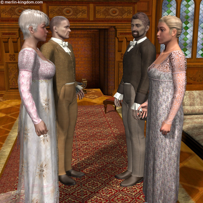 At the appointed time for their guests to arrive, Sir Henry and Lady Suzanna stood together, holding hands, in their spacious living room. Lord Michael Northwood, and his wife, Duchess Lydia, arrived, and looked around clearly impressed by the estate. Sir Henry said, "Lord Northwood, Duchess Lydia, Thank you both so much for gracing us, and accepting our invitation to visit." |