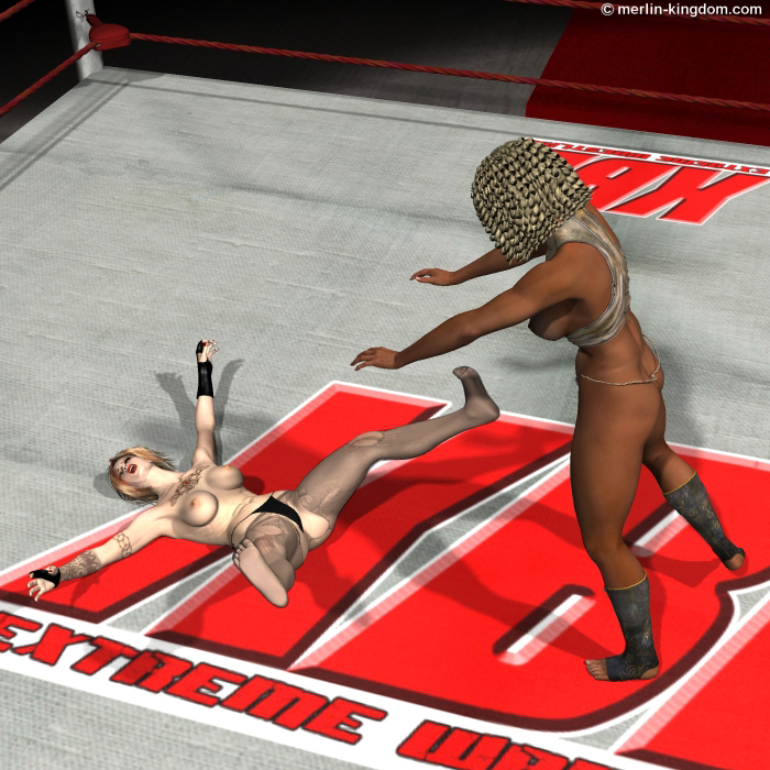 Skinner suddenly hurls Goth Girl to her back on the mat. That must have expelled whatever breath Goth Girl had left in her lungs.