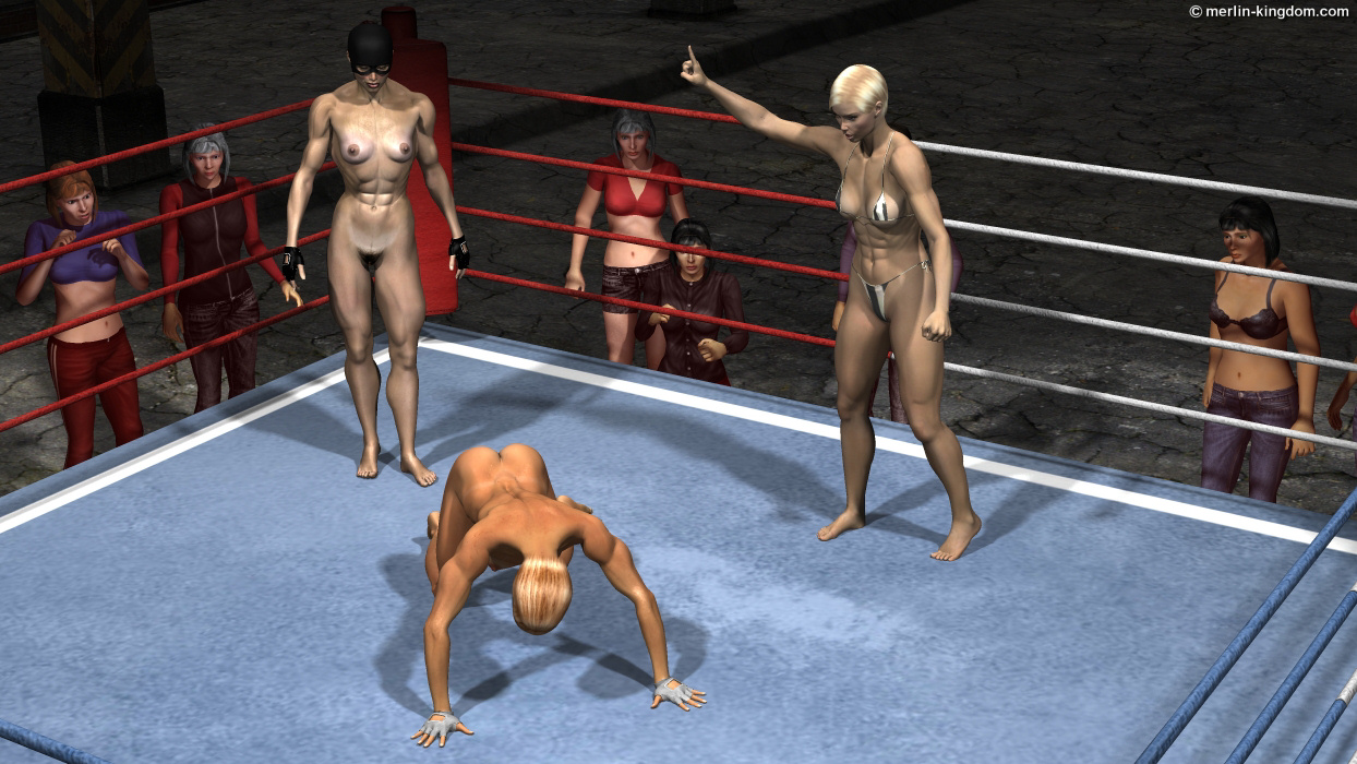 Stacy is down on her knees gasping for breath. The ref looks at the Hood to see if she wants to follow on, but the Hood signals that the ref can take a count.