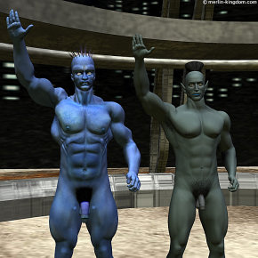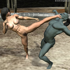 have ever seen before. A female like form awaits at the bottom. They are approached by the alien female and told they are here to fight 2 champions for the survival of their home world. Both women are enraged, but thinking that this situation even must be the work of their own Gods, they accept the challenge. The women leave the cage and await their opponents who enter from the other side of the arena. They look human, but are clearly not! The 2 nude aliens are announced as father & son - Triiad & Escad. They salute the arena. The female alien then states that there will be 2 fights to the finish with no rules. At stake is the survival of Hippolyte and Lythia's homeland! The alien announces that the first fight will be between the son and daughter. Lythia & Escad eye each other as they move close to each other in the centre of the arena. |