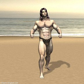 | Hercules' ships arrives at first light and anchors off the beach from the Amazon city. Hercules' companions are afraid to go ashore, so Hercules swims to the beach on his own and walks up from the shore towards the impressive looking city. |