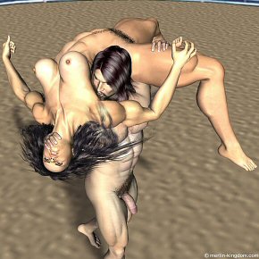 trial of weightlifting & fighting. "If you win you can keep the treasure and have your pleasure of any Amazon." she explains. "When I win, I will demand the pleasure of your body, Queen Hippolyte!" replies Hercules accepting the challenge. "When I win, you will become my slave!" retorts the Queen angered by Hercules' arrogance. Hercules laughs heartily and agrees to Hippolyte's challenge. |
