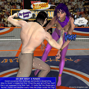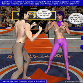 Finally after five hard fought undercard matches we reach NightStorm! main event. Tonight the undefeated WCF Champ Severa will face the rising star from the Marvels, Violet, who gained the rights to challenge her winning last week's 12 women tournament. Violet joined the WCF only a couple of months ago and after a difficult beginning she begun to show her value defeating high-ranked opponents and is here tonight to prove that she can take on the final challenge. Tonight was a very tough evening for the WCF "good-girls" as the Crimson Stars were bested and battered by Severa team, the Lethal Deity. Let's see if the Marvels can fare any better against the Deity leader. |
