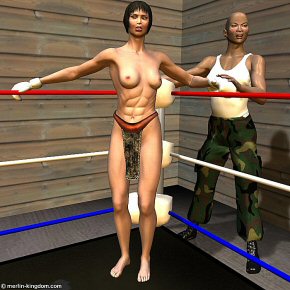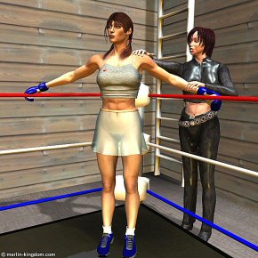 Referee, to fix up a fight for Pippa. Claude gets in touch with Soo Lan, a Mongolian woman who runs a group of Asian fighters. Soo suggests a match against Mai Ling, a Chinese girl who has recently joined her group and who is also looking for her first fight. So Claude arranges the fight and hires the Pit for a late night session in the middle of the week when the place is empty. It is just gone midnight when Soo Lan and Jackie escort their two fighter down into the Pit where Claude, who is acting as the Referee, is already waiting. Both girls are visibly nervous as they climb between the ropes and enter the ring for their first real fight. Claude now formally introduces the combatants as if the fight were in front of an audience. "On my right from Xian, China at 5 ft 7 in and 140 lb - Mai Ling!" "On my left from Buffalo, USA at 5 ft 8 in and 142 lb - Pippa!" |