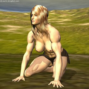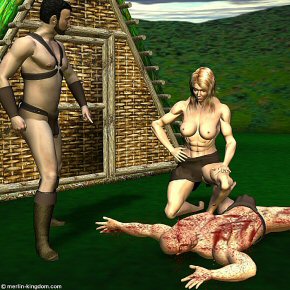 that village to get help. Three hours later Sven returns from the neighbouring village accompanied by a young muscular woman dressed only in a loin cloth. Her name is Rhynna and she has just arrived in the area from a land far to the east beyond the mountains. She is said to be the most fearless and skilful raptor hunter in the land, but Sven is doubtful that a female on her own can possibly rid them of this murdering raptor. |