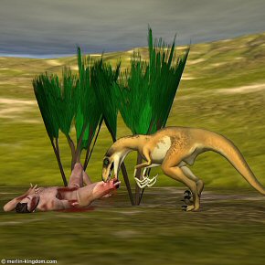 | In the centre of the glade the raptor is busy eating Haa's body and is