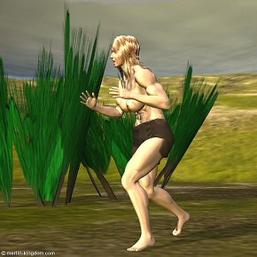 Sven goes into the hut and after a few moments comes out and vomits into the grass. He looks a greenish shade of grey as he reports, "Gee's son Haa's body is missing. The raptor has taken his son! I will go and collect the men of the village and we will go with you to get this raptor!" "NO!" commands Rhynna, "It is not for you to hunt this raptor, he is mine! I will take care of the beast and will bring you his head by nightfall or I will die in the process!" Before Sven can argue Rhynna gets to her feet and moves off into the bush following the all too obvious trail that the raptor has made. |