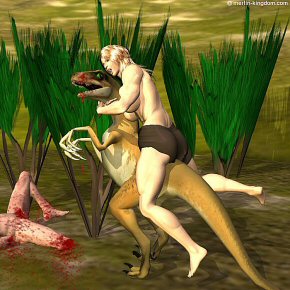 Seeing Gee's badly mauled body Rhynna drops to knee alongside the bloody corpse. She looks carefully at the slashes in Gee's body and smells the raptor's saliva that has congealed in the sun. "It is a young male raptor!" she declares. "He is strong and vicious, and he has a taste for human blood!" "Can you track him down, so we can kill him?" asks Sven anxiously. |
