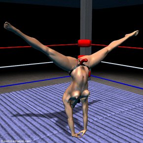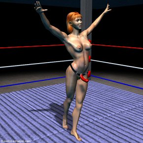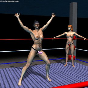 has now come for Pippa to fight her first strap-on fight. Jackie has arranged for Pippa to fight a young woman called Suki at an all-female club that specialises in tough girl-on-girl sex fights. The fight is to be fought without a referee with the simple rule that the winner is the first girl to penetrate her opponent with the full length of her dildo. Suki is the first to enter the ring. She is introduced as "The Red Devil" - Age 24, 5' 7" 130 lb with 24 fights and only 2 losses. Suki does some impressive warm up gymnastics as the announcer is speaking. |