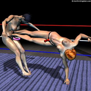 | Instructed by the announcer, the two fighters come to the centre of the ring and touch dongs. Then the bell sounds and the fight starts. For a few seconds the two fighters circle each other looking for a opening, but then Suki makes the first move by kicking Pippa in the side of her knee joint. The blow is painful and Pippa staggers sideways momentarily dead-legged. | |