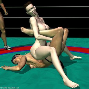 arch enemy, the hermaphrodite club-fighter called Helena. Two years previously Helena and Pippa had shared an apartment, but after a disagreement over money Helena had fought with Pippa and had raped her. Since that time Pippa had been desperate to get revenge on Helena by beating her in a public fight. When Jackie went to seek out Helena to arrange the fight she found that the she-male had moved to a neighbouring city and was now fighting in a notorious underground sex fight club called "Cock Fights Anonymous". The club mostly staged naked male fights or mixed sex fights, but they also staged female strap-on fights. Jackie learn that Helena was the club's star attraction fighting in both the mixed sex fights and the strap-on matches. She had a fearsome reputation for fucking both her female and male opponents! It proved easy for Jackie to arrange the fight with Helena. Using Pippa's ring name of "The Dark Avenger" she secured a fight against Helena for the following Saturday night. Here are 4 thumbnails that give a taste of the action: |