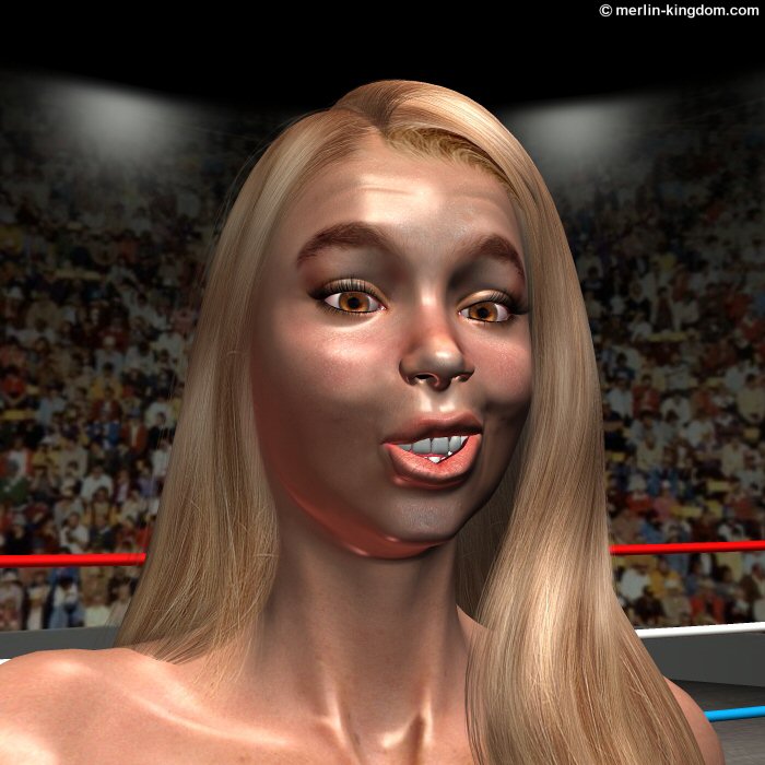 Cherie chuckles as she replies, "Ya know, if you didn't have that stupid mouthpiece in, I would be able to understand you. Guess I'll just have to knock it out of your mouth."