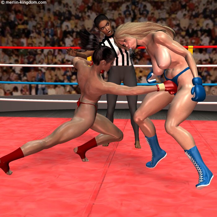 As the bell sounds, Tinta rushes Ally and slams a low blow to her crotch area. Her right slams hard into Ally's thong, doubling her over.