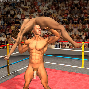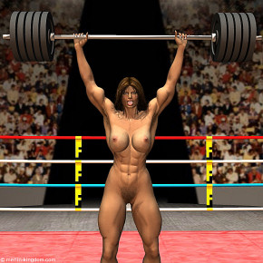 The scene is an underground arena called "The Mixed Zone" which specialises in strictly nude combat and strength contests between women & men involving wrestling, boxing & weightlifting. For the past 2 weeks, a braggart of a muscular male named Zandor has put up $25,000 to any woman who could lift a heavy barbell placed in the ring. So far no woman has come close and Zandor is confident that tonight will be no exception. Here are 4 thumbnails that give a flavour of the action: |