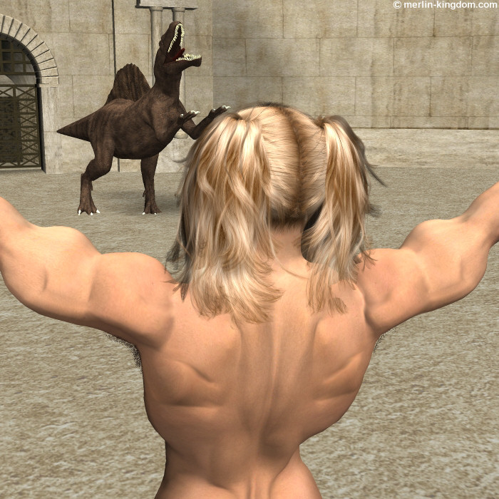 From across the arena, a huge hulking creature rears up on its hind legs and roars again as it approaches Aylee.