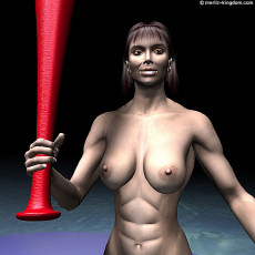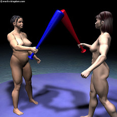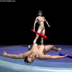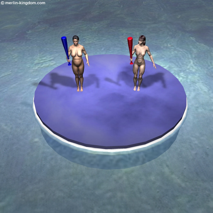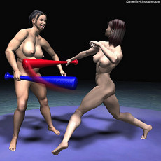 the arena for the next event. In part 1 we saw Gill and Julie succeed in combat on the beam against the Hood. Now these two women face each other in a bungee bat fight which will take place on a floating platform in the centre of the flooded arena. These are rules of this contest: - The loser will be the first woman to fall off the float, or to let go of her bat, or to be knocked out to a count of 10. - The bat must be gripped in one hand only - no two handed blows are allowed - There is to be no punching, kicking or any other physical contact between the fighters - No blow shall be struck when a fighter is down The winner of this contest will win $10,000 and will have the chance to face the Hood in the ultimate test. Now let's join the contestants in the arena: |