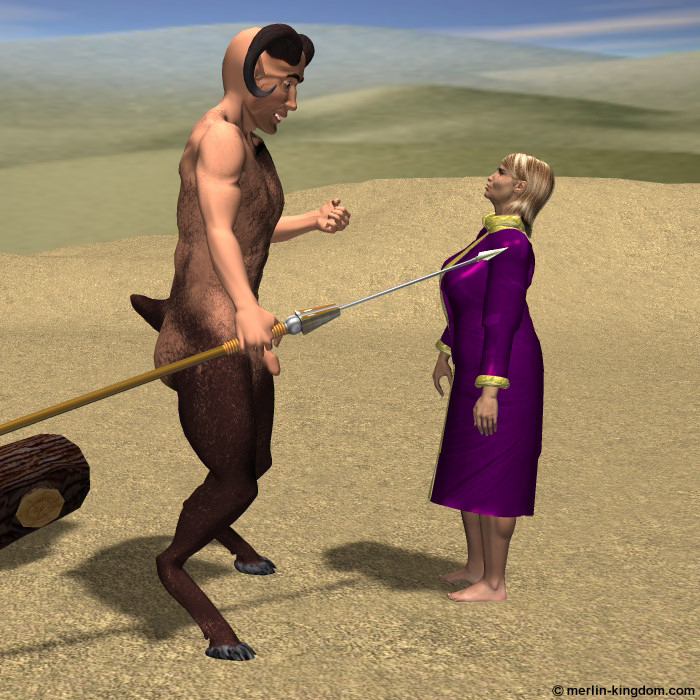 | Lharna comes upon a giant half man, half animal form known as a satyr. The creature seated upon a huge log, naked, holding a large spear in its' right hand. Spying Lharna, it rises and confronts her, blocking her way demanding tribute to pass or die. |