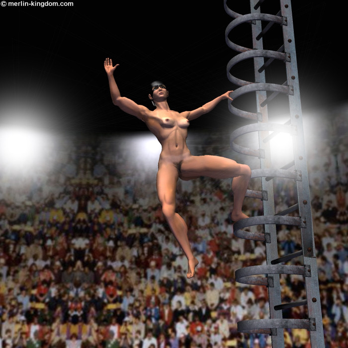 ... it is nothing compared the roar of approval that greets the Hood as she clambers down the outside of the entrance ladder.
