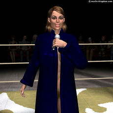 well-built woman in a dark blue robe steps into the ring with the mic in
