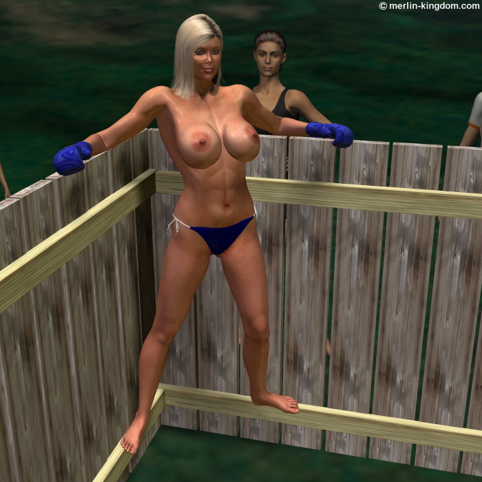 | Almost the exact same thoughts and worries filled Cassie’s head as well. The blonde drove the worries away as she simply concentrated on Rachelle and the fight and putting the redhead down for a ten count. A smile crept across Cassie’s face as she came to terms with the worries. The busty blonde vixen paced nervously in her corner, wearing her blue bikini bottom and blue boxing gloves. |