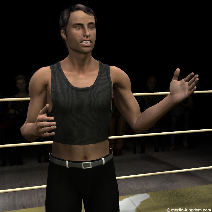 In the ring, the ref prepares to introduce tonight’s wrestlers.