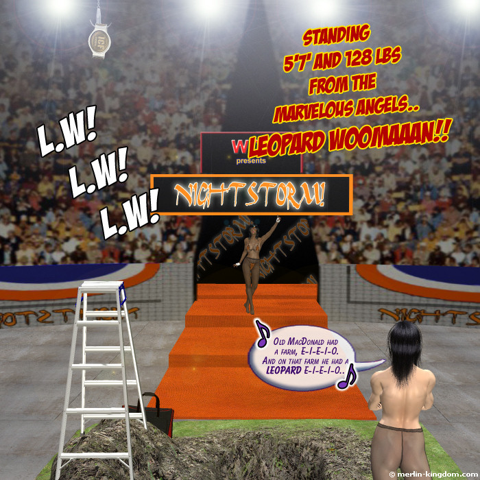 With the belt hanging from the hook, it's now Leopard Woman's to turn to enter the Arena. The crowd love the undefeated Angel!